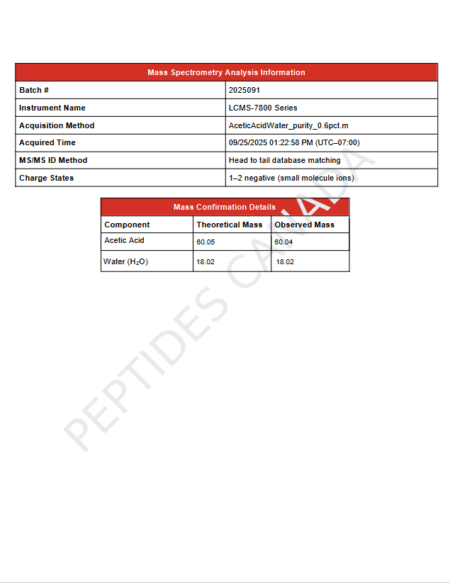 Acetic Acid 0.6% Solution is a sterile, non-pyrogenic aqueous formulation containing 0.6% (v/v) acetic acid in ultra-pure water, provided for controlled laboratory research use. It offers a mildly acidic environment for solubilisation, dilution, or vehicle media in experimental protocols where peptide or protein stability, pH control, and sterility are required.
