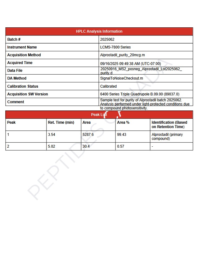 Analytical characterization confirms the expected mass of 354.48 Da, consistent with the theoretical molecular weight for Alprostadil. Research-grade preparations are typically verified by HPLC purity testing to ≥ 98 % and validated through LC-MS for molecular identity, ensuring suitability for receptor-binding, biochemical, and mechanistic assay applications.