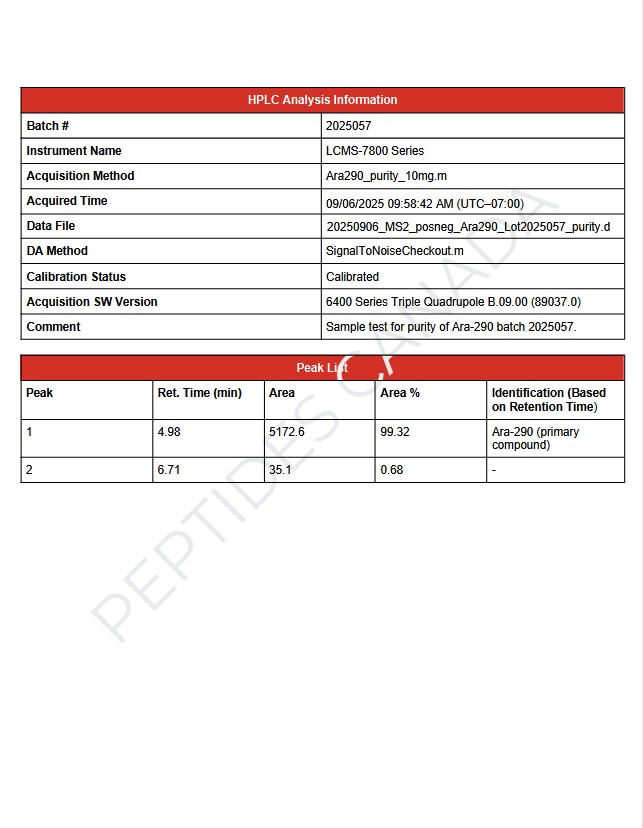 Ara-290 is a short synthetic peptide engineered to selectively activate specific EPO receptor pathways. Due to variable peptide manufacturing parameters, a single definitive molecular formula is not listed. Batch identity is confirmed analytically.