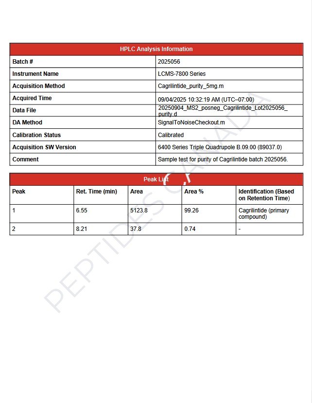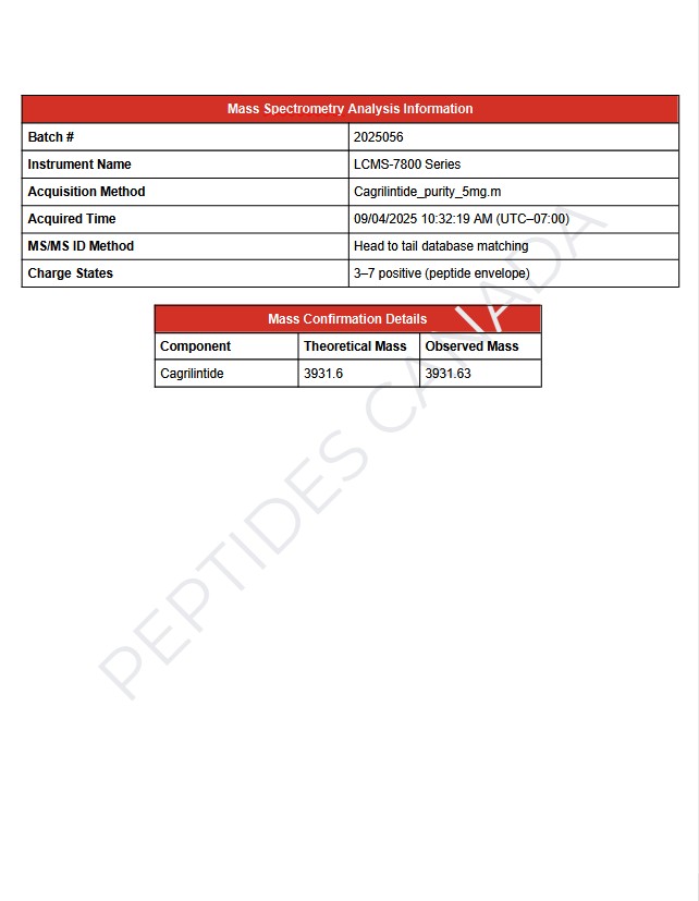 Cagrilintide is a modified peptide optimized for extended activity through specific structural stabilization. Due to formulation-dependent modifications, a definitive molecular formula is not listed. Identity and purity for this batch are analytically verified.