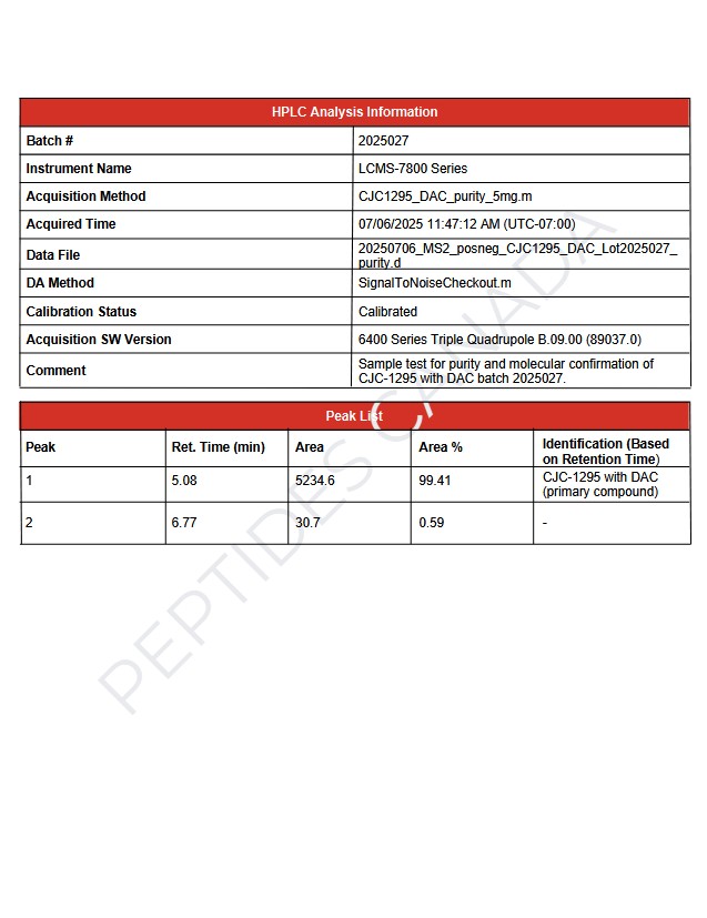 CJC-1295 with DAC (Drug Affinity Complex) is a synthetic peptide analog of growth hormone–releasing hormone (GHRH). This modification was developed to improve stability and extend circulating half-life compared to native GHRH, potentially resulting in longer stimulation of growth hormone release. By binding to albumin in the bloodstream, the DAC component may reduce enzymatic degradation and renal clearance, thereby sustaining biological activity.
