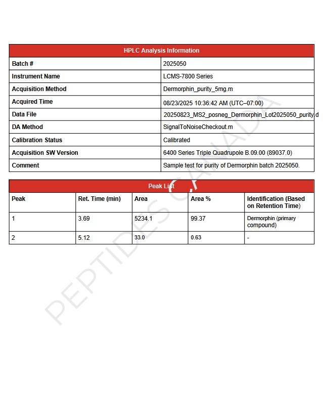 Dermorphin (Batch # 2025034) exhibits an LCMS-confirmed molecular mass of 802.9 Da and a measured purity of 99.09 %. Analytical verification confirms its suitability for advanced laboratory investigations involving receptor pharmacology, neurochemical signaling, and pain modulation research. This compound is strictly for research use only.
