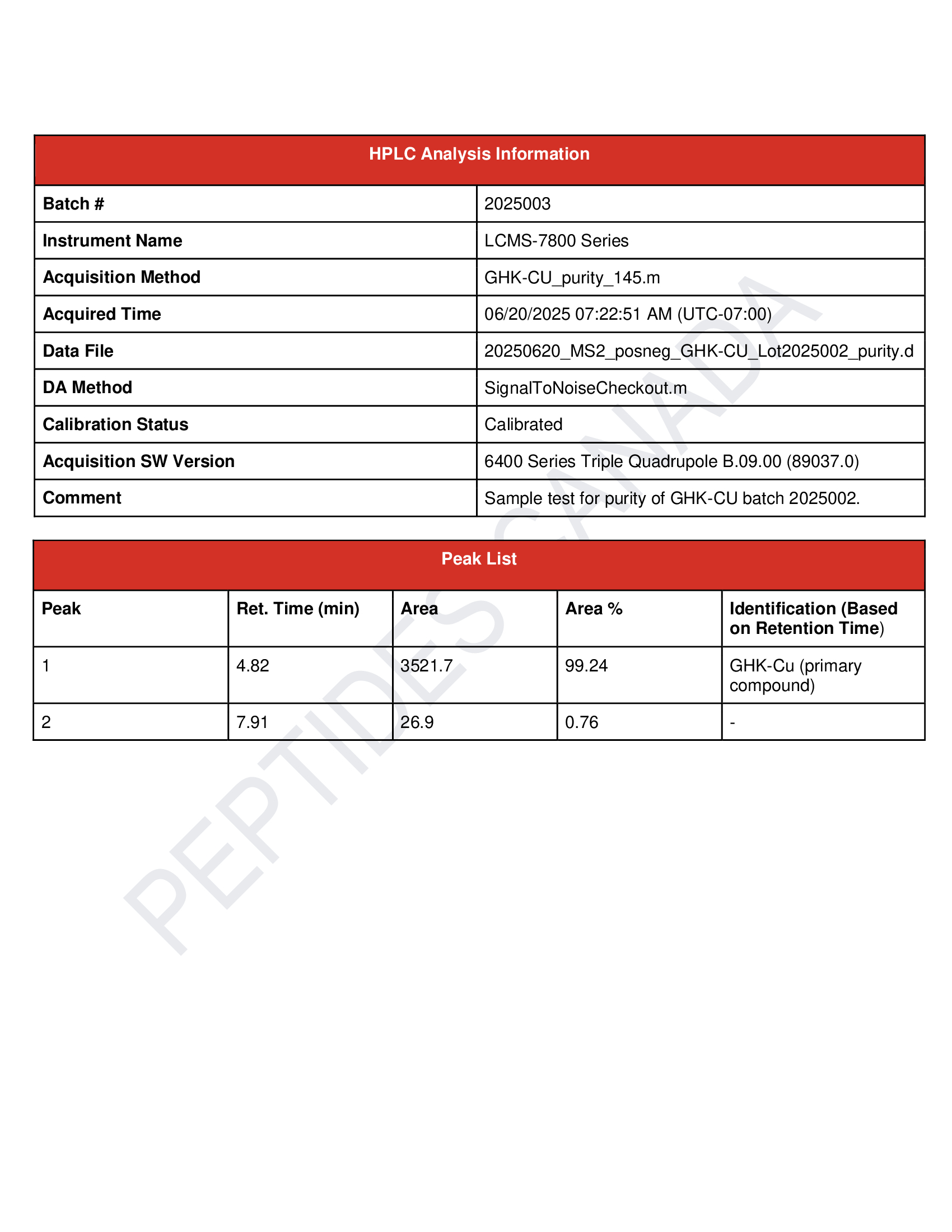 We take a laboratory-first approach to quality. Each batch is made under controlled conditions and verified by an independent lab (HPLC/MS). We only ship batches that test ≥99% purity, and we provide a full COA, including identity, methods, and chromatograms, for your review.
