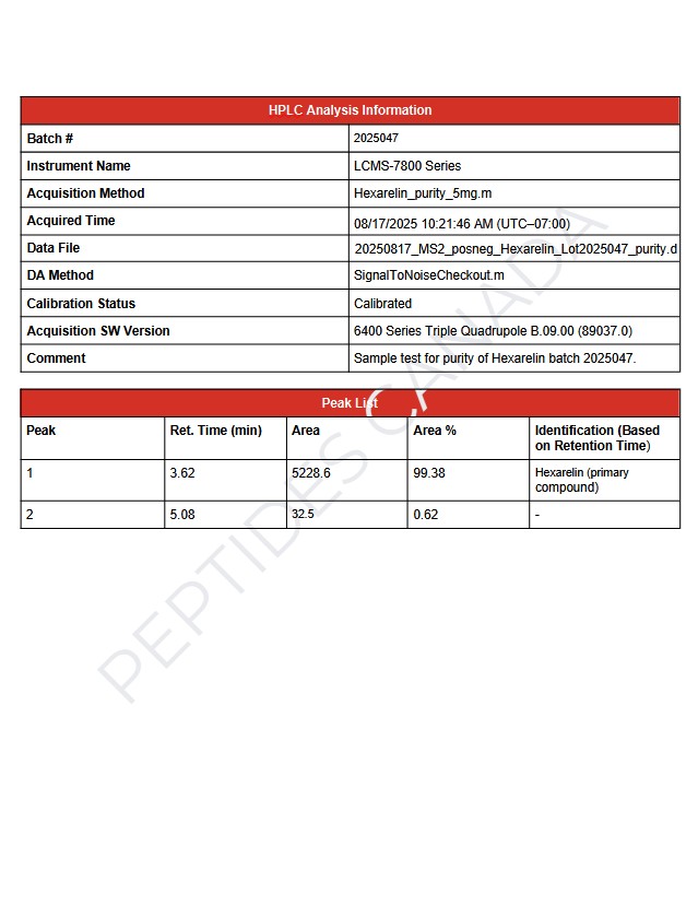 Hexarelin (Batch # 2025018) has been confirmed by LCMS to possess an observed molecular mass of 887.0 Da and an HPLC-verified purity of 99.23 %. Analytical data confirm high compound integrity suitable for advanced laboratory studies on growth hormone release, cardiac physiology, and metabolic function. This peptide is provided solely for scientific research use.
