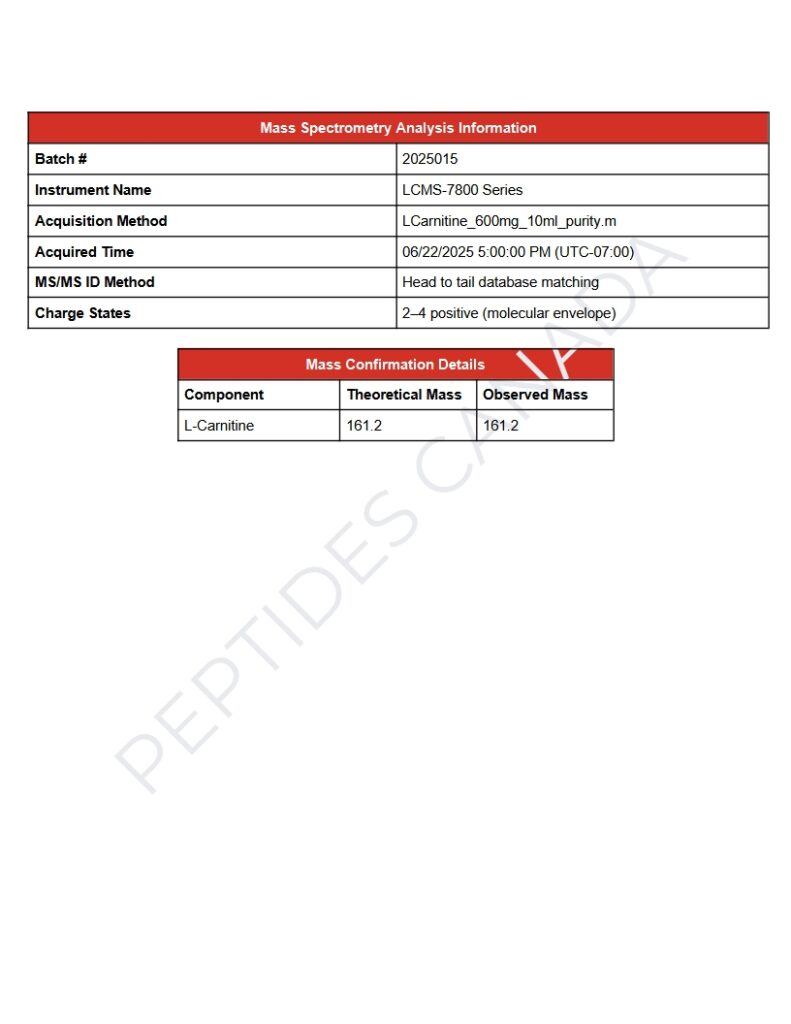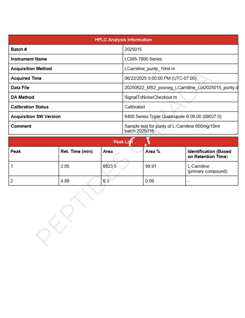 This batch of L-Carnitine Injectable Solution Peptide has been third party lab tested and verified for quality. Size: L-Carnitine 10ml Contents: L-Carnitine Form: Liquid Solution Purity: 99.83%