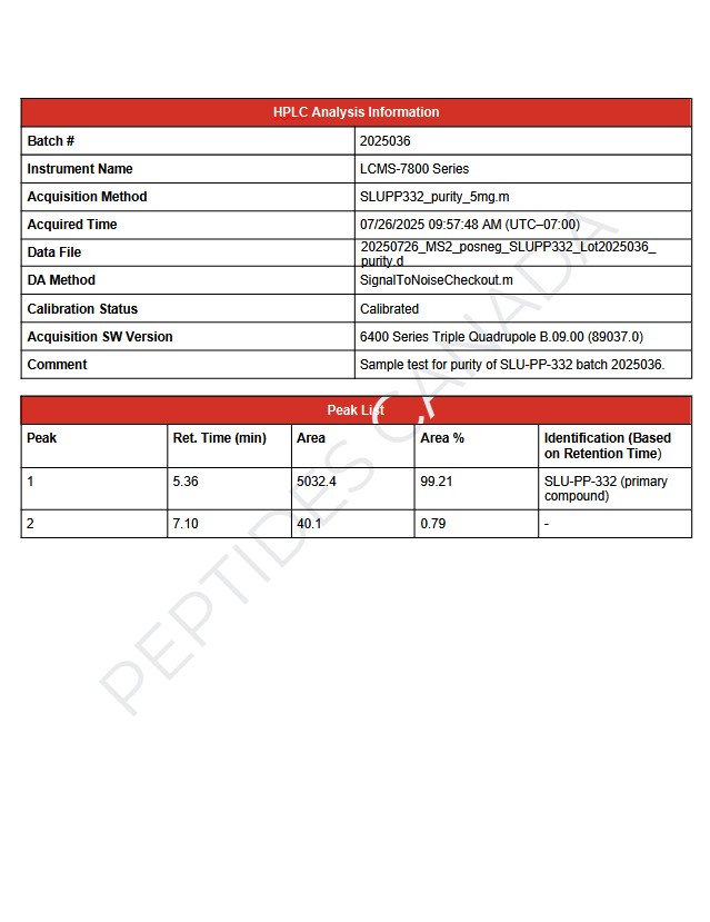 SLU-PP-332 is a synthetic small-molecule agonist of the estrogen-related receptors (ERRα, ERRβ, and ERRγ)—nuclear receptors that regulate mitochondrial biogenesis, oxidative metabolism, and energy expenditure. It has been identified as a potent metabolic modulator capable of mimicking the molecular effects of endurance exercise. SLU-PP-332 is of growing interest in metabolic, mitochondrial, and exercise physiology research for its ability to reprogram energy metabolism in skeletal muscle and adipose tissue.