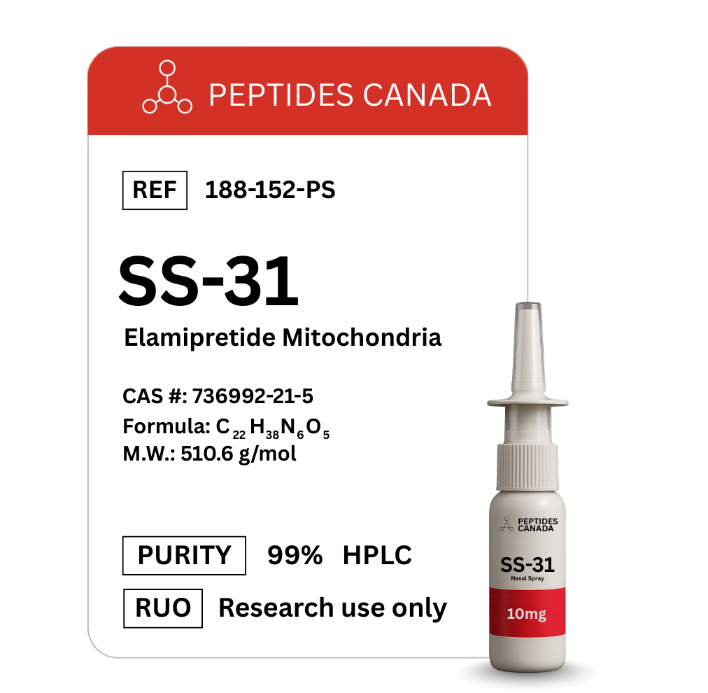 SS-31 (also known as Elamipretide) is a synthetic tetrapeptide with high affinity for mitochondrial membranes. It has been studied extensively for its ability to selectively target cardiolipin, a phospholipid unique to the inner mitochondrial membrane, and is of interest in research investigating oxidative stress, mitochondrial dysfunction, and age-related cellular decline.